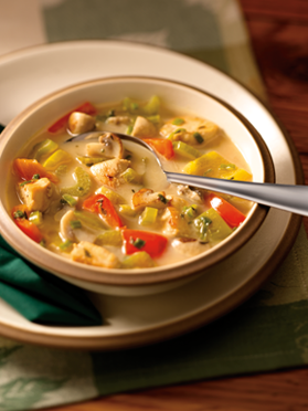 Trim all visible fat from chicken and cut into 1” pieces; clean and cut mushrooms, pepper, celery, and scallions. Heat oil in a large saucepan over medium heat. Add minced garlic and chicken; cook until chicken is no longer pink, about 5 minutes. Add bell peppers, celery, and mushrooms. Cook until vegetables are tender, about 7 minutes. Add scallions, broth, water (optional), cream, thyme, black pepper, and parsley. Simmer until ready to serve.